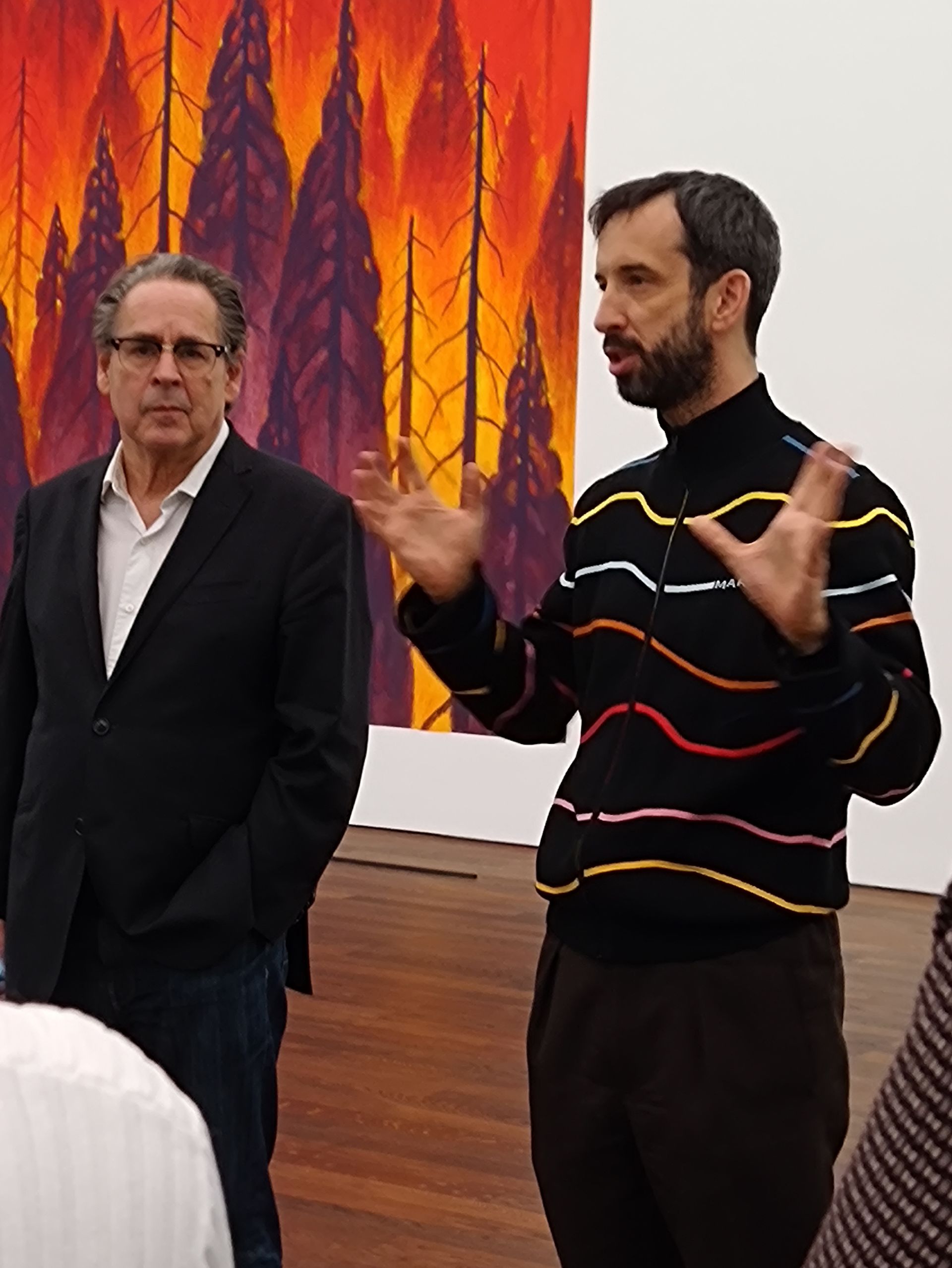 Udo Kittelmann, the curator of Museum Frieder Burda, and the Swiss artist Nicolas Party in front of "Red Forest", 2023, pastel, 1063 x 623 cm, Foto: Martina Sauer, November 2,2023