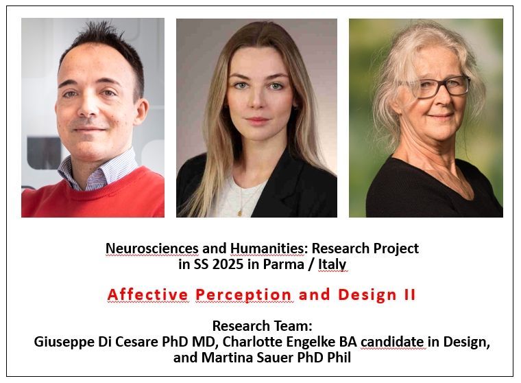 They are the neuroscientist Giuseppe Di Cesare from the research group form Parma in Italy on mirror neurons and vitality forms and philosopher and image scientist Martina Sauer form the Institute for Image and Cultural Philosophy from Germany and her research on vitality semiotics (VS) and her former student, the B.A. candidate in design, Charlotte Engelke, form the Fresenius University of Applied Sciences, AMD, Hamburg, who in their joint research project in Parma are specifically investigating on a neuroscientific basis if there is a difference in understanding of illustration and design objects between laypeople and design students.