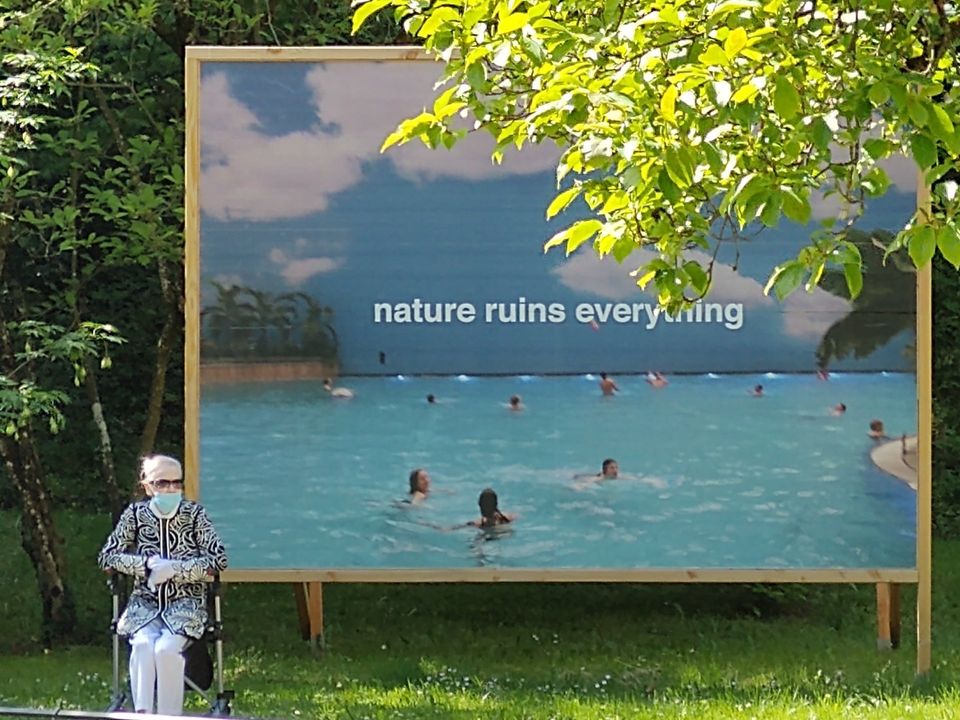 Auf den Punkt gebracht wird dieses widersprüchliche Verhältnis zuletzt mit dem von mir geschossenen Foto des Plakats mit einer (scheinbar?) zufällig davor sitzenden älteren Person mit Maske auf einem Rollator am 26.5.2020, also mitten in der Corona-Krise. Mit Wucht weißt es uns darauf hin, dass auch wenn wir noch so zielstrebig und gewissenhaft die Natur als andersartig und uns bedrohende verfolgen und ihre Rohstoffe bedingungslos ausbeuten, uns genau das niemals wirklich gelingen kann. Denn wir sind ein Teil von ihr, und jedes Ausbeuten entspricht einem Ausbeuten von uns selbst. Wir verändern die Natur, und wir verändern uns mit ihr. Als Teil von ihr, hängen wir von ihr ab. Wir formen sie, und sie formt uns. Schmutziges Wasser, synthetische Lebensmittel, geringe Artenvielfalt - das alles wirkt auf uns zurück. Wir formen mit unserem Tun uns selbst, und die Natur - auch in Form eines Corona-Virus - formt uns mit. So wird beides, das Plakat und die Folgen des Virus zu einem aussagekräftigen Kommentar zur gegenwärtigen Krise unserer Gesellschaft, die dominiert von wirtschaftlichen Interessen, den Zusammenhang von beidem kaum mehr kennt.