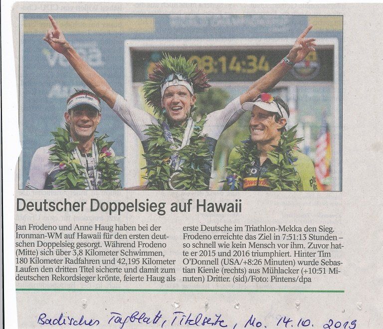 Seit den 80er und 90er Jahren, als die Postmoderne bzw. der Dekonstruktivismus ihren Höhepunkt feierte, wissen wir: Sprache und Bilder formen unser Verständnis von Welt und prägen unser Selbstverständnis entscheidend mit. Wenn dann mit der Meldung des Badischen Tagblatts auf der Titelseite vom 14.10.2019 der Doppelsieg der beiden Deutschen Spitzensportler Jan Frodeno und Anne Haug beim Ironman in Hawaii gefeiert wird, enttäuscht mich die Berichterstattung als Frau doch sehr. Denn weder auf der Titelseite noch im Sportteil sind die konkreten Zeiten von Haug angegeben, daneben wird sie als Siegerin nur im Sportteil als "dritte" nach Sebastian Kienle abgebildet. Auch sprachlich verwundert der Beitrag. Zu Frodeno heißt es auf der Titelseite, er erreichte das Ziel "so schnell wie kein Mensch vor ihm". Biologisch gesehen kann keine Frau Frodeno übertreffen. Daher wird im Spitzensport zwischen Frauen und Männern unterschieden. Ist Haug also kein Mensch? Sicherlich hat das der Verfasser nicht gemeint. Schade um die verpasste Chance, auch Frauen für ihre Spitzenleistungen Mut zu machen.